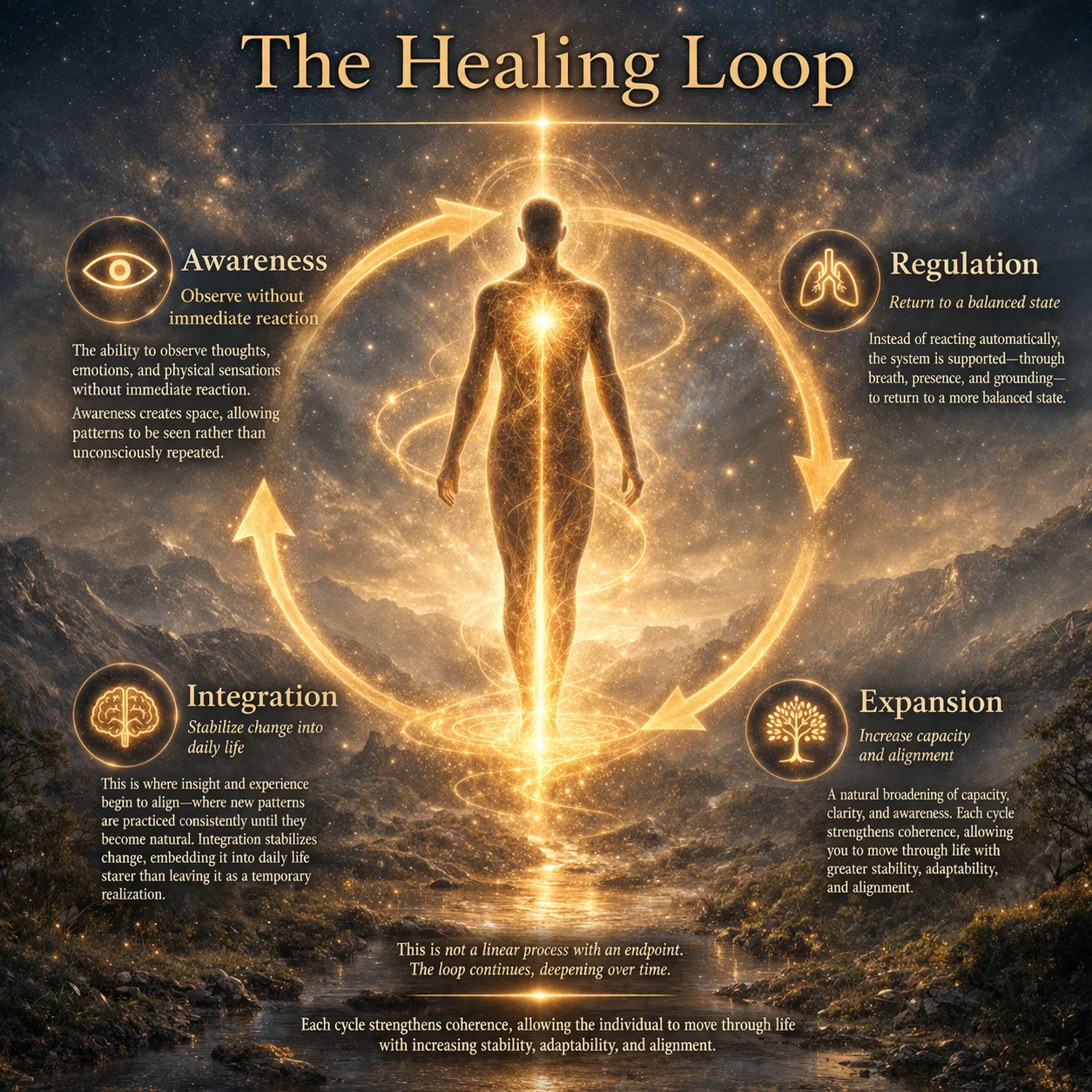 Once regulation is established, integration can occur. This is where insight and experience begin to align—where new patterns are practiced consistently until they become natural. Integration stabilizes change, embedding it into daily life rather than leaving it as a temporary realization. From this foundation, the system moves into expansion—a natural broadening of capacity, clarity, and awareness. Importantly, this is not a linear process with an endpoint. The loop continues, deepening over time. Each cycle strengthens coherence, allowing the individual to move through life with increasing stability, adaptability, and alignment.