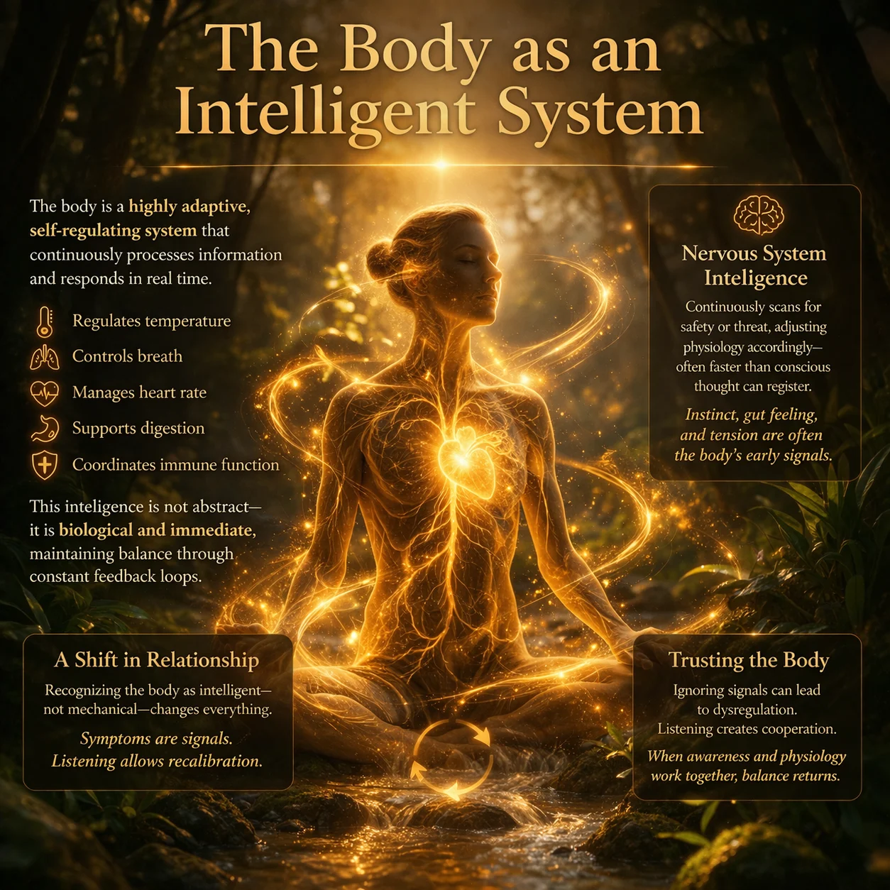What becomes clear over time is that nothing within you is working against you. Thought patterns, emotional responses, and physical sensations are not problems to eliminate, but signals to understand. As awareness deepens and regulation stabilizes, these signals begin to organize rather than overwhelm. The mind becomes clearer, the body more responsive, and the connection to self more accessible. This is where coherence emerges—not as a concept, but as a lived experience.