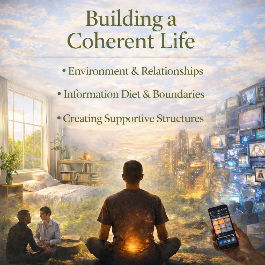 Building a coherent life is where internal alignment begins to shape external reality. It’s not enough to cultivate awareness, regulation, and clarity internally—your environment, relationships, and daily structures must support and reflect that coherence. Without this alignment, even strong internal work can be disrupted by chaotic surroundings, conflicting inputs, or draining interactions. A coherent life is intentionally designed to reduce friction, reinforce stability, and support continued growth.