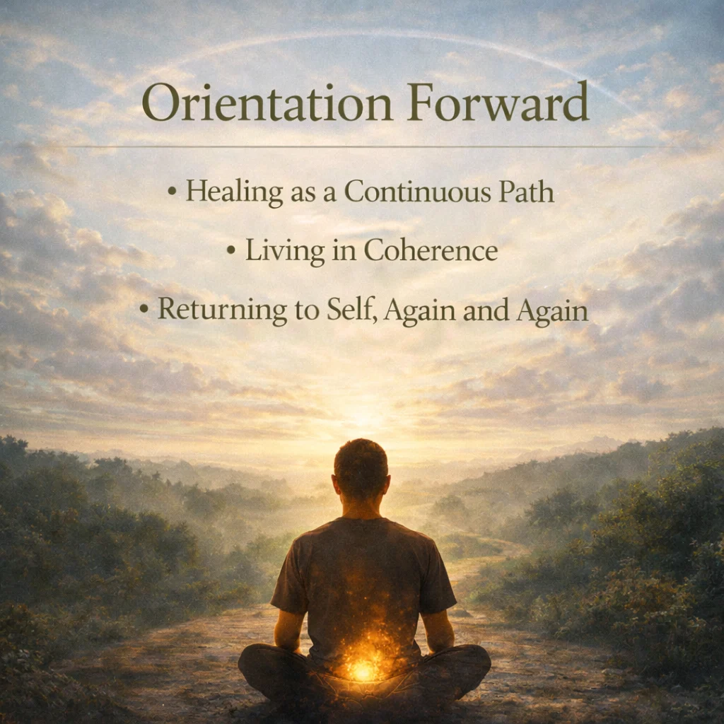 This closing section is not an endpoint—it is a reorientation. Healing is not something completed once and then left behind; it is an ongoing relationship with awareness, regulation, and alignment. What has been built throughout this framework is not a rigid system, but a living process—one that adapts, deepens, and refines over time. Orientation forward means carrying this understanding into daily life, not as effort, but as a steady return point.