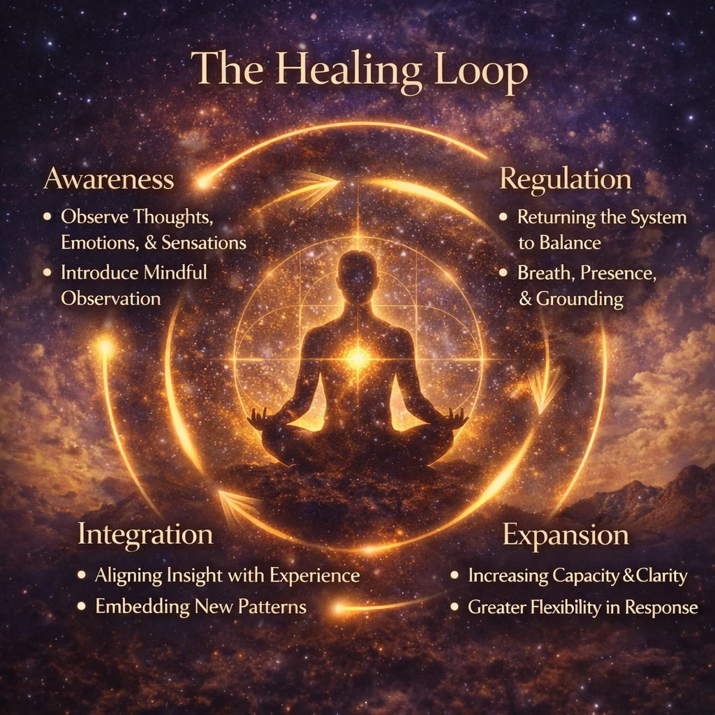 The Healing Loop is a continuous, self-reinforcing cycle that describes how lasting transformation occurs. It begins with awareness—the ability to observe thoughts, emotions, and physical sensations without immediate reaction. Awareness creates space, allowing patterns to be seen rather than unconsciously repeated. From this space, the next step becomes possible: regulation. Instead of reacting automatically, the system is supported—through breath, presence, and grounding—to return to a more balanced state.